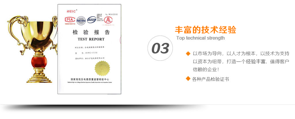 浙江滬高電器有限公司是氧化鋅避雷器跌落式熔斷器、戶外高壓隔離開關、隔離開關、絕緣氧化鋅避雷器、真空斷路器、瓷瓶絕緣子等產品專業生產加工的公司,擁有完整、科學的質量管理體系。浙江滬高電器有限公司的誠信、實力和產品質量獲得業界的認可。歡迎各界朋友蒞臨參觀、指導和業務洽談。 公司在建立現代企業制度的基礎上,建立了一套完善的人事管理、生產管理、質量管理、財務管理、營銷管理、信息管理等綜合管理體系。